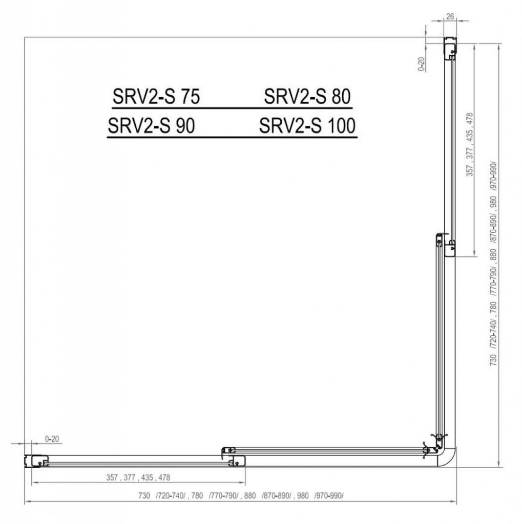K vytvoření rohového sprchového koutu je třeba objednat 2 kusy posuvných dveří typu SRV2-S. Kombinací různých rozměrů obou dílů získáte čtvercovou nebo obdélníkovou variantu sprchového koutu. (např. 750 x 900 mm, 900 x 900 mm, 800 x 1000 mm, atd.)