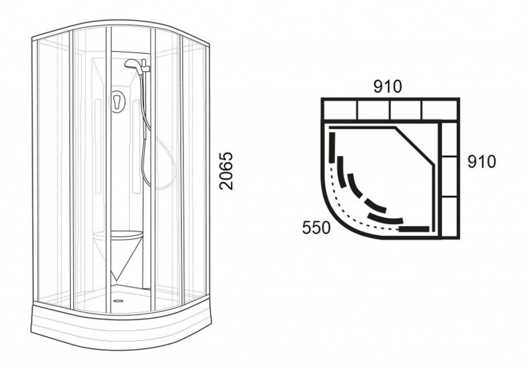 Výrobek tvoří dva pevné rovné díly a čtyři ohýbané díly tvořící posuvné dveře.