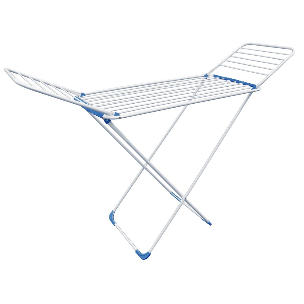 Sušák na prádlo na postavení IrisDry kombinuje moderní design s funkčností. Vyrobeno z lakované oceli a plastových prvků, má elegantní vzhled v bílé barvě s modrými akcenty. S 18 metry sušicí plochy snadno pověsíte dvě plné dávky prádla. Silnější tyče o průměru 7 mm a 16 mm zajistí, že vaše prádlo uschne bez hlubokých záhybů. Stojan je vybaven plastovými nožičkami pro stabilitu a ochranu podlahy. Jeho žebrovaný systém umožňuje pohodlné sušení menších šatních předmětů, jako jsou ponožky, které lze zavěsit mezi žebra. Ve složeném stavu zabírá regál minimální prostor, kompaktní rozměry 133,5 x 55,5 x 3,8 cm usnadňují jeho skladování.