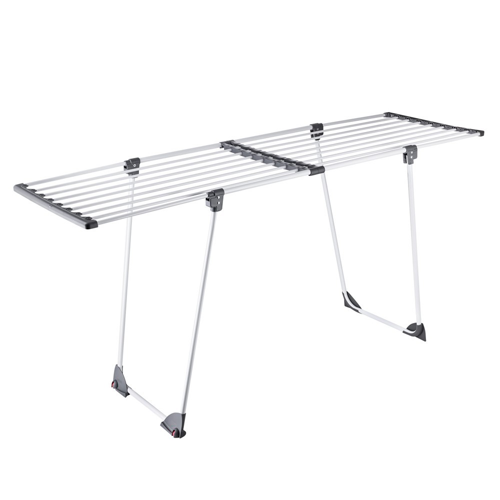 Sušák prádla na postavení VioletDry je vynikající kombinací funkčnosti a elegantního designu. Vyrobeno z lakované oceli a plastu, vyznačuje se tlumeným barevným schématem bílé a šedé. Se skládacím mechanismem nabízí VioletDry 17 metrů sušícího prostoru, což umožňuje pohodlné zavěšení i dvou plných dávek prádla. Silnější tyče o průměrech 9 mm, 13 mm a 16 mm zajistí sušení prádla bez hlubokých záhybů. Stojan je vybaven plastovými nožičkami, které jej stabilizují a chrání podlahu před poškrábáním. Kolečka na jedné straně usnadňují přemisťování stojanu. Ve složeném stavu umožňují jeho kompaktní rozměry 104 x 57 x 7 cm snadné skladování. Funkce rozšíření umožňuje přizpůsobit jeho velikost aktuálním potřebám. Speciální systém háčků na obou stranách stojanu navíc umožňuje pohodlné sušení menších šatních předmětů, jako jsou ponožky.