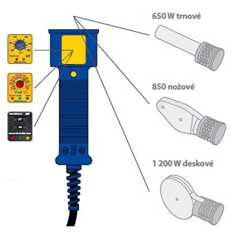 Kombinovat lze 3 různé typy regulace teploty se třemi typy topných těles. Z hlediska kompletace jsou svářečky dodávány ve 3 variantách - SOLO (samotná svářečka) a v sadách MINI nebo PROFI, které mohou být dodávány buď s černými, nebo modrými nástavci. modrý DT povlak vyniká dvojnásobnou životností oproti běžnému černému povlaku