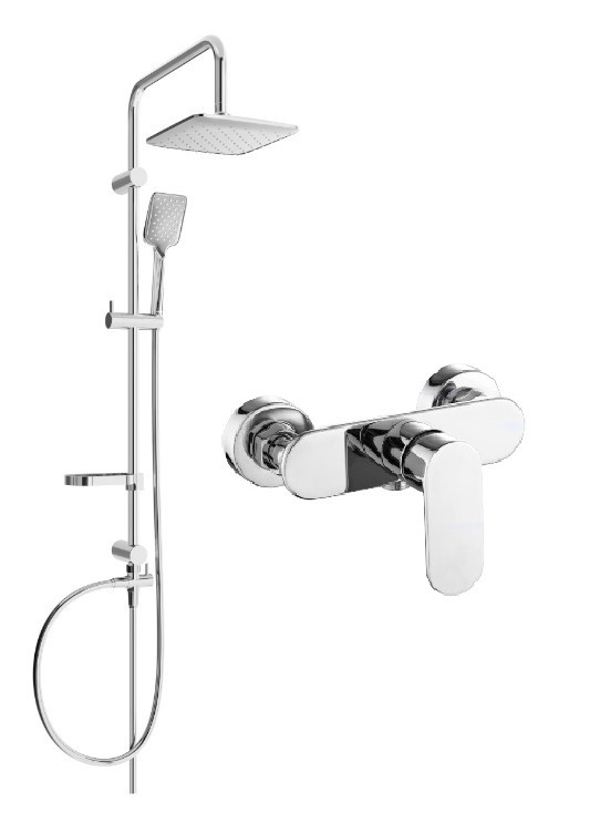 Sprchový sloup je vyroben z nerezové oceli a ABS. Sloup je uchycený ke stěně pomocí dvou nastavitelných, stěnových držáků, kdy je možné upravit v případě, že již máte před vyvrtané otvory. Hlavová sprcha je z plastu čtvercového tvaru, rozměru 20x20 cm a je umístěna pomocí kulového kloubu na horním rameni. Kloub umožňuje nastavení směru proudění vody podle vašich potřeb. Na tyči je umístěná plastová mýdlenka a posuvný držák s plastovou 1 funkční ruční sprchou, která je propojená pomocí hadice dlouhé 150 cm k přepínači mezi sprchami. Sprchový sloup je navržen k propojení baterie pomocí hadice dlouhé 50 cm.