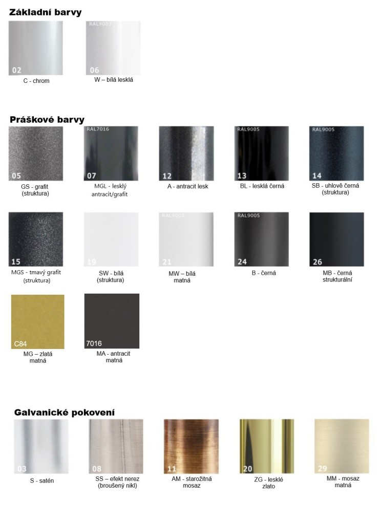 | Barva | Starožitná mosaz,Matná mosaz,Satén,Chrom,Černá matná,Lesklý antracit/grafit,Nerez (broušený nikl),Bílá matná,Zlatá lesklá,Černá lesklá,Bílá (RAL 9003),Grafit (structura),Antracit/kovový grafit,Černá (structura),Tmavý grafit (structura),Bílá (structura),Černá strukturální |