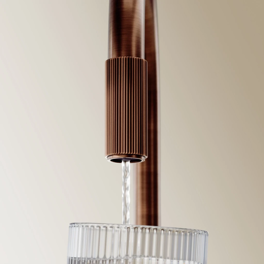 Kuchyňská baterie OMNIRES SWITCH kombinuje minimalistický design s vyváženými proporcemi a praktickou funkčností a dodává jak běžnou, tak filtrovanou vodu. Výrazné, přesně drážkované detaily umožňují intuitivní použití a označují dva nezávislé body otevření vody: běžnou u baterie a filtrovanou na konci výtoku. Jednoduše otočte kroužek a naplňte sklenici rychlým proudem pitné vody. Otočný, vytahovací výtok dále vylepšuje funkčnost baterie a poskytuje větší volnost u dřezu. Usnadňuje oplachování, mytí a plnění nádobí a také důkladné čištění celého povrchu.