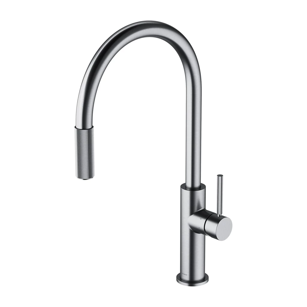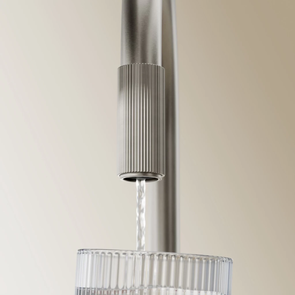 Kuchyňská baterie OMNIRES SWITCH kombinuje minimalistický design s vyváženými proporcemi a praktickou funkčností a dodává jak běžnou, tak filtrovanou vodu. Výrazné, přesně drážkované detaily umožňují intuitivní použití a označují dva nezávislé body otevření vody: běžnou u baterie a filtrovanou na konci výtoku. Jednoduše otočte kroužek a naplňte sklenici rychlým proudem pitné vody. Otočný, vytahovací výtok dále vylepšuje funkčnost baterie a poskytuje větší volnost u dřezu. Usnadňuje oplachování, mytí a plnění nádobí a také důkladné čištění celého povrchu.