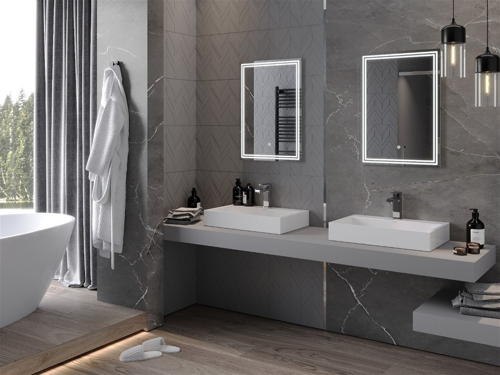 Moderní a jednoduché zrcadlo kolekce TACO je vybaveno LED podsvícením, které se snadno ovládá pomocí dotykového tlačítka přímo na ploše zrcadla. Zrcadlo je vybaveno vyhřívací podložkou ANTI-CAR, která eliminuje zamlžení skla.