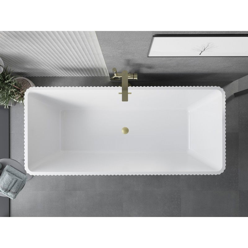 Specifikace produktu: Rozměry: 170 x 75 cm Výška: 58 cm Hloubka: 45 cm Instalace: Volně stojící Materiál: Sanitární akrylát Barva: Bílá Povrchová úprava: Kartáčované zlato Konstrukce: Drážkovaná Otvor pro přepad: Ano Otvor pro baterii: Ne Sifon a zátka click-clack jsou součástí dodávky Odolné vůči baterii, baterii a UV záření