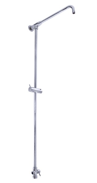 Teleskopická sprchová tyč s přepínačem k baterii s hlavovou a ruční sprchou.
