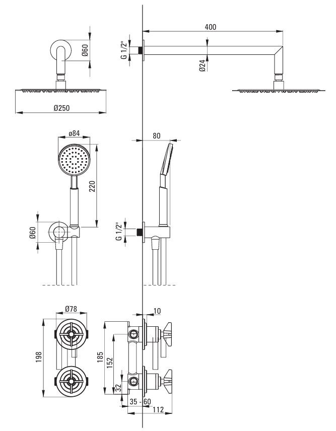 - Mosaznou hlavovou sprchu o průměru 250 mm s funkcí dešťového proudu a odvápňovacím systémem