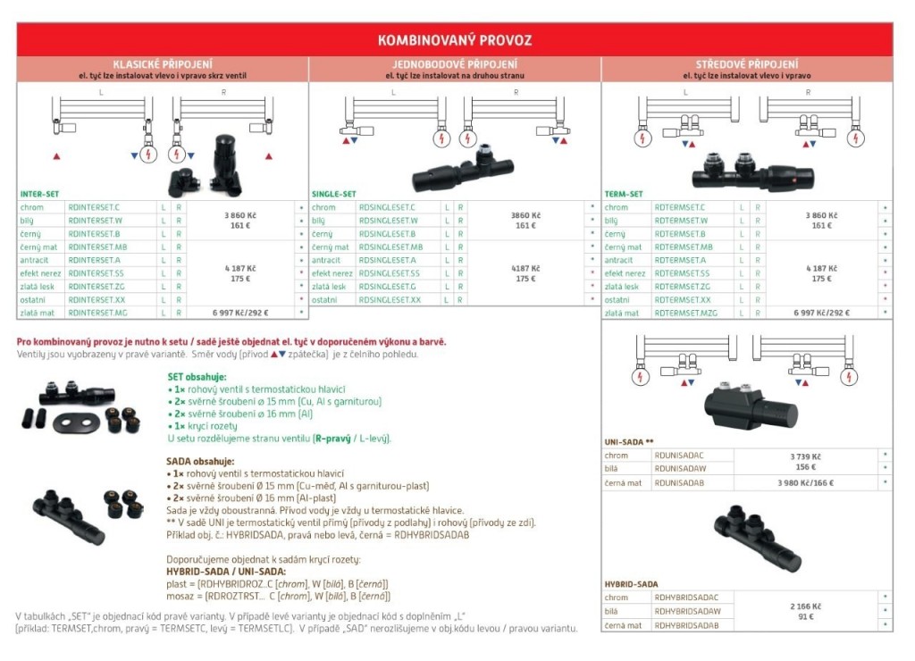 Středový připojovací ventil TERM-SET (Z4) je určena pro otopná tělesa se středovým připojením s roztečí 50 mm a závitem 1/2 nebo 3/4“, zejména pro koupelnová tělesa – tzn. žebříky. Garnitura, termostatická hlavice i kompletní příslušenství je k dispozici ve 17-ti různých barvách vždy s velmi kvalitní povrchovou úpravou. Ventily dodáváme včetně svěrného šroubení na Cu i na PEX-AL-PEX.
