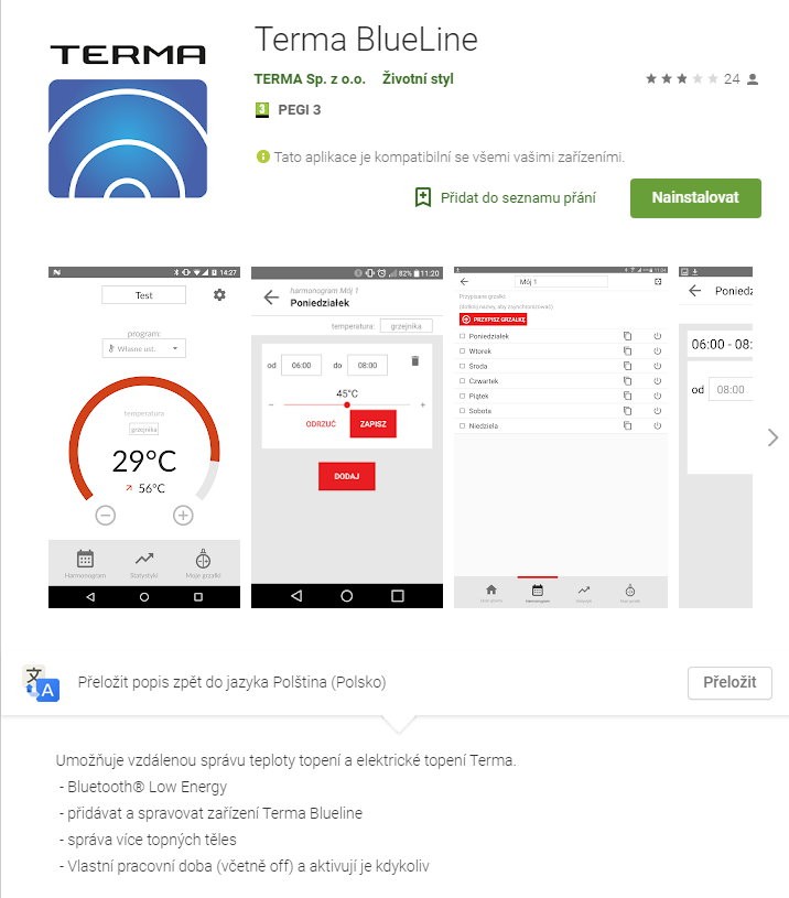 Můžete použít libovolné mobilní zařízení, jako je například smartphone s technologií Bluetooth nebo tablet k vzdálenému řízení topné tyče. Ovládací prvek BLUE-Line pro Android a iOS je k dispozici v příslušných internetových obchodech. Jedna aplikace může naprogramovat a řídit libovolný počet zařízení série BLUE (topné články a radiátory).