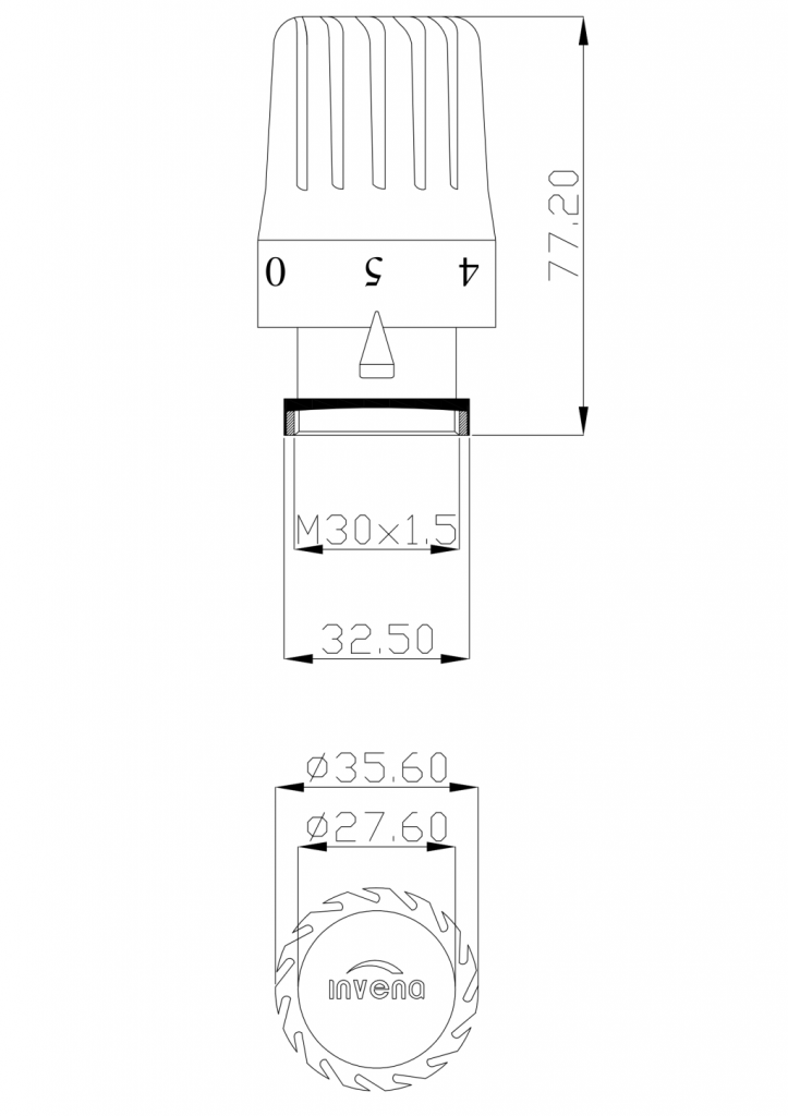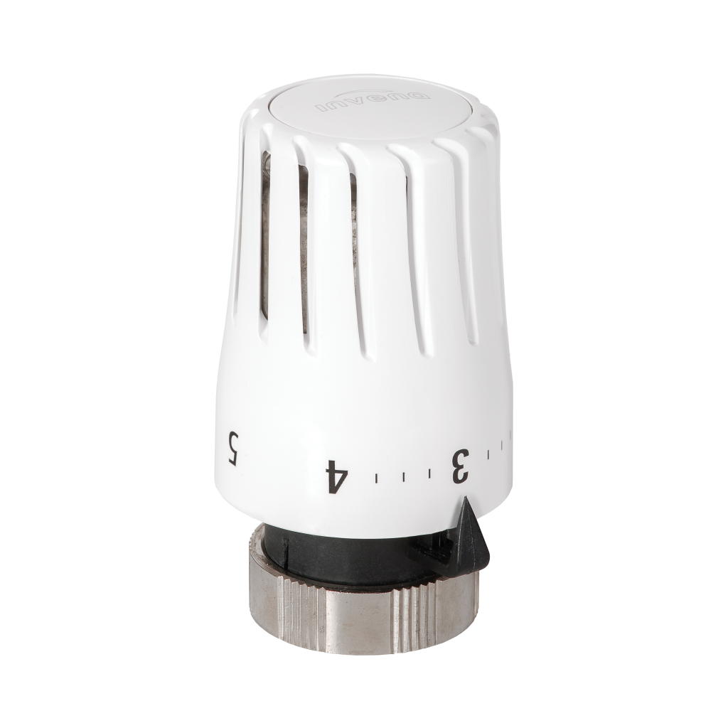 Termostatická hlavice Invena PROV s upevňovací maticí z poniklované mosazi a otočnou plastovou hlavicí v bílé lesklé barvě. Hlavice pasuje na termostatické vložky a ventily M30×1,5 s uzavíracím rozměrem 11,5 mm.