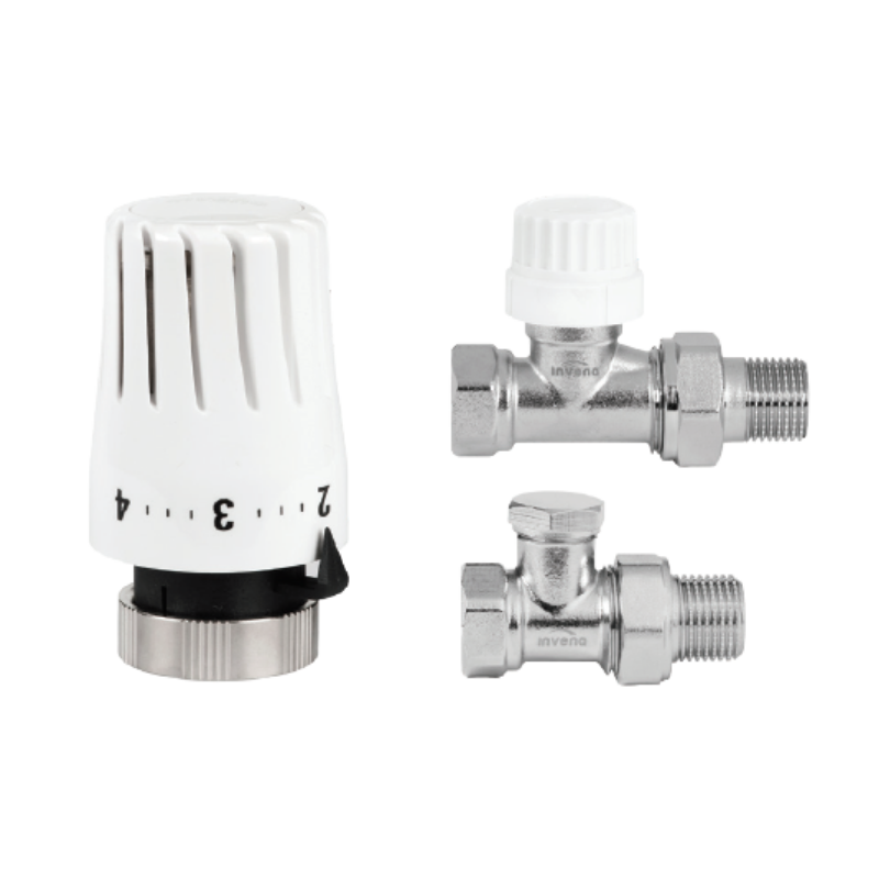 Pro připojení radiátorů v systému ústředního vytápění z ocelových trubek. Rozsah nastavení teploty: 6-28°C. Ventily z poniklované mosazi, šroubové spoje opatřené O-kroužkem, ventily kompatibilní s ostatními hlavicemi z nabídky INVENA.