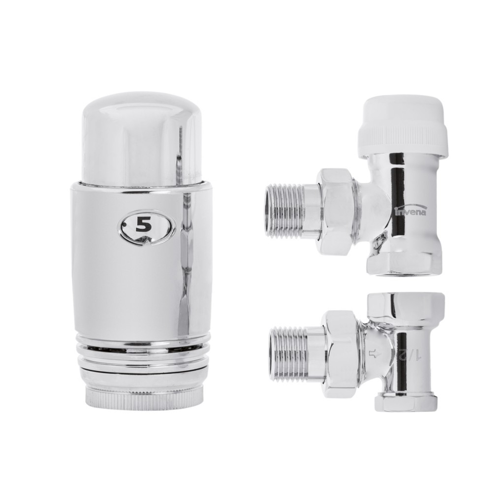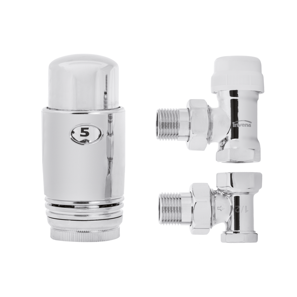 Pro připojení radiátorů v systému ústředního vytápění z ocelových trubek. Rozsah nastavení teploty: 6-28°C. Ventily z poniklované mosazi, šroubové spoje opatřené O-kroužkem, ventily kompatibilní s ostatními hlavicemi z nabídky INVENA.