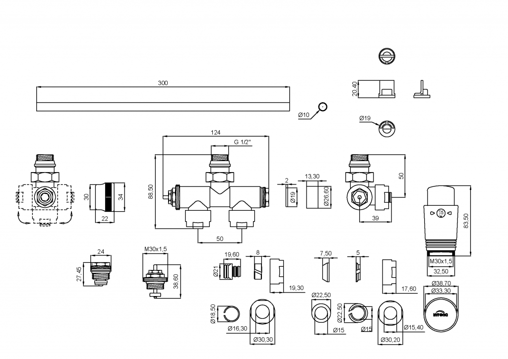 - jednootvorový termostatický ventil ½” s roztečí 50 mm