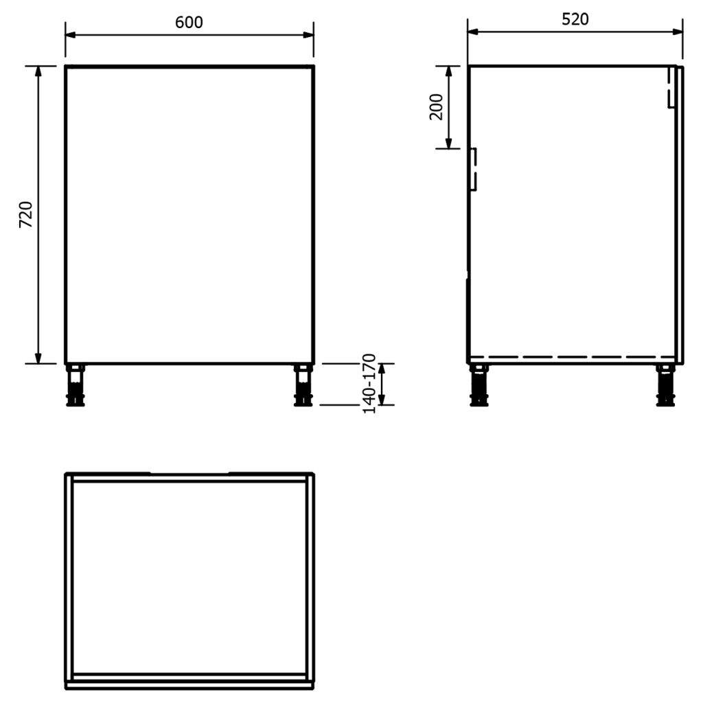 - Součástí každé spodní skříňky jsou 4 ks výškově stavitelných (140-170 mm) nožiček a 2 ks úchytů pro připevnění soklu