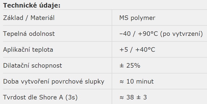 Jednosložkový lepicí a těsnicí tmel, na bázi MS polymeru. Vytvrzuje vulkanizací vzdušné vlhkosti, vytváří vysokopevnostní, elastický spoj.