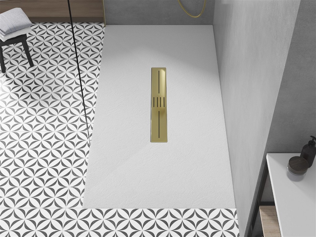 Sprchová vanička TORO je dostupná v barevných variantách: bílá a černá. Vybrat lze i z obdélníkových, krytech odtoku, v nabídce jsou v barevném provedení: chrom, zlato, černá a bílá.