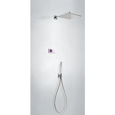 Termostatický podomítkový elektronický sprchový set SHOWER TECHNOLOGY; - Zabudovaná termostatická elektronická kontrolní jednotka (2-cestná).- Pevná sprcha 300x300 mm. s kloubem. Materiál Mosaz (1.34.138.30).- Držák s nástěnným přívodem vody (207.182.01).- Ruční sprcha, proti usaz. vod. kamene (202.639.01).- Flexi hadice SATIN (91.34.609.15): v chromovém provedení
