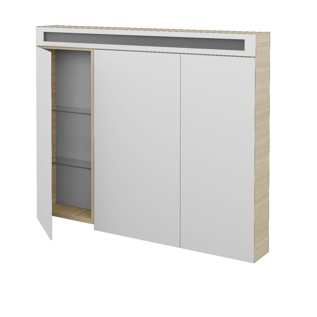 Zrcadlová skříňka AIR GA3OE 100 je vyrobena ve trojdveřovém provedení s oboustrannými zrcadly. Ta jsou ke korpusu připevněna pomocí značkových pantů Grass, které jsou k zrcadlům přichyceny pomocí speciální, patentem chráněné a v Dřevojasu zkonstruované, kovové lišty.