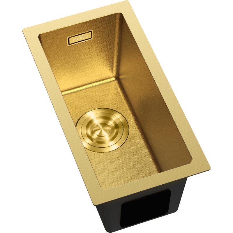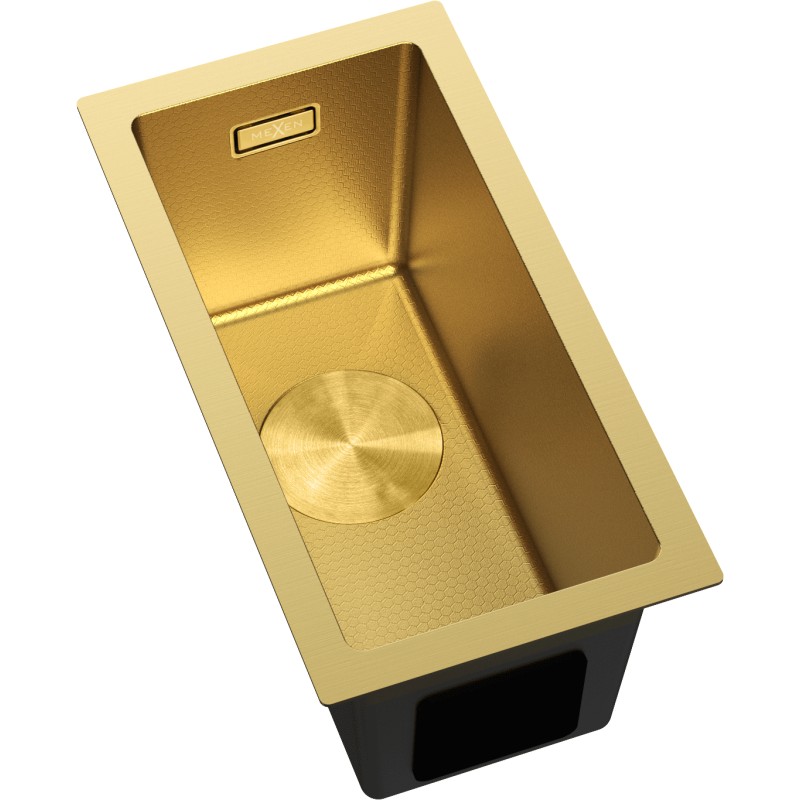 Specifikace produktu: Rozměr: 230x440x200 mm Hloubka dřezu: 200 mm Rozměry dřezu: 390x180 mm Tloušťka ocelového hran dřezu: 3 mm Tloušťka ocelového hran dřezu: 1 mm Poloměr zaoblení rohů dřezu: R10 Průměr odtoku: ø92 mm Typ: 1-dřez Typ: Vestavný, Pod desku Materiál: Nerezová ocel AISI 304 Barva: Zlatá Povrch: Voština Povrchová úprava sifonu: Zlatá Otvor pro přepad: Ano Otvor pro baterii: Ne Ruční sifon s odpadkovým košem a zátkou Přídavný kryt odtoku Skrytý otvor pro přepad Zvukově izolační rohože k dřezu Odolnost vůči nárazům, poškrábání a změně barvy Odolnost vůči vysokým teplotám a tepelným šokům Povrch pro snadné čištění