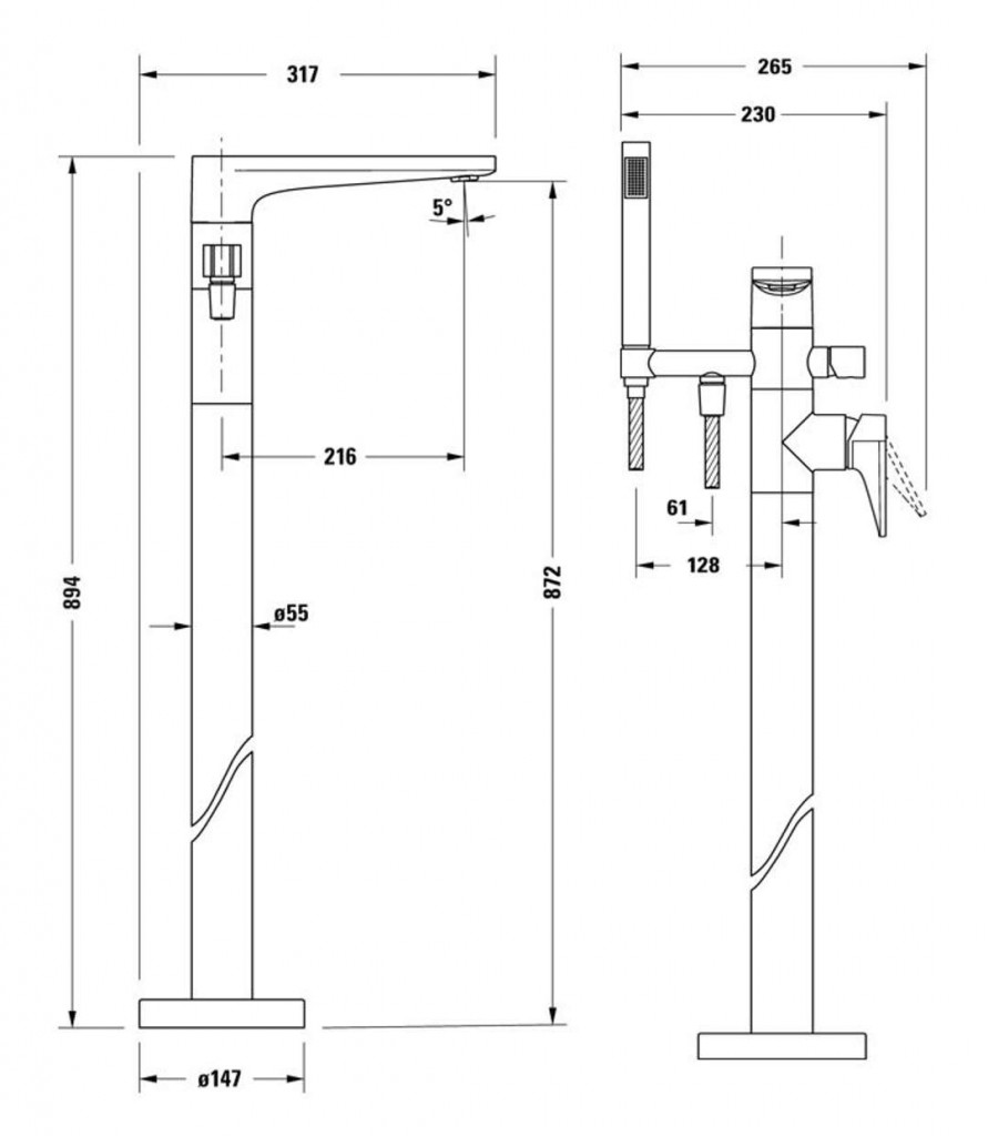 - s držákem sprchy, sprchovou hadicí a tyčovou ruční sprchou