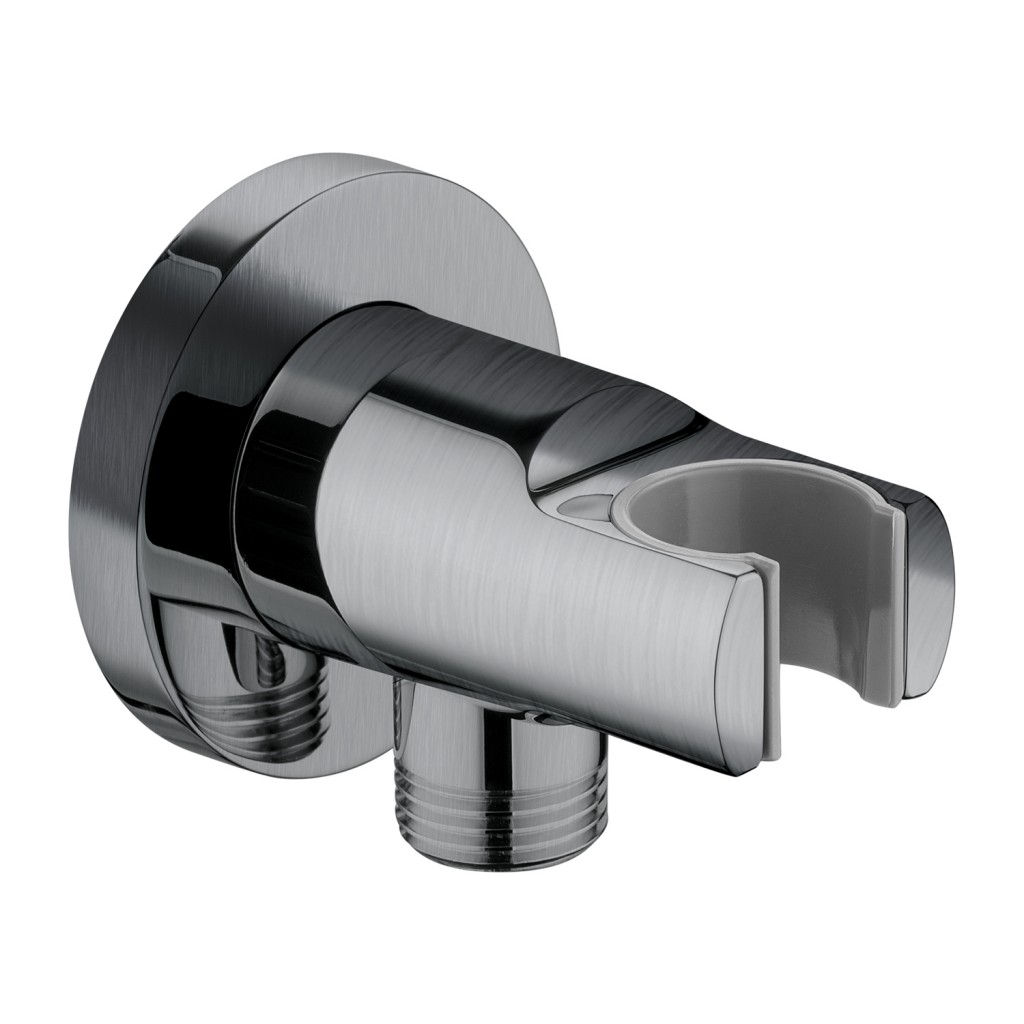 Mosazný držák ruční sprchy s vyústěním pro podomítkovou montáž kulatého tvaru.