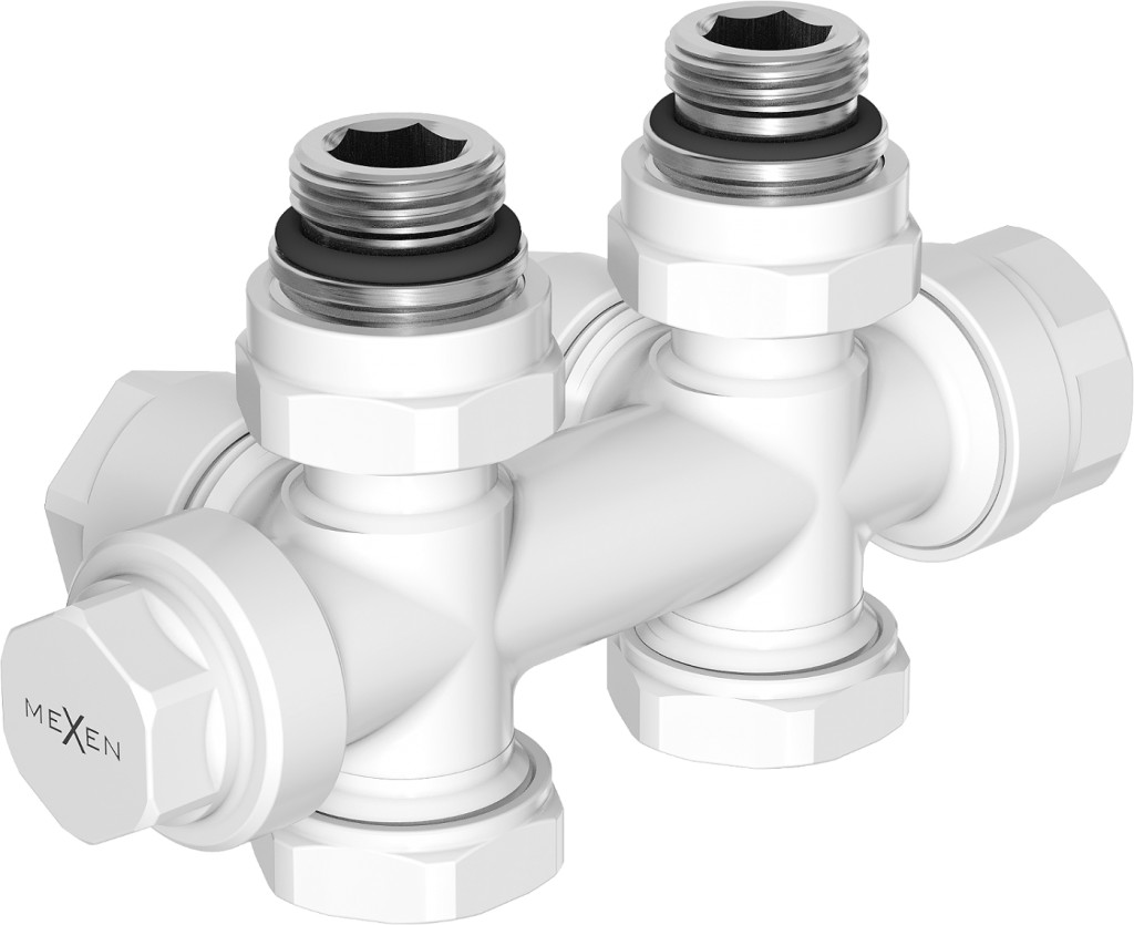 Uni-Term úhlový ventil pro radiátor s roztečí 50 mm, oboustranný. Tento typ připojení je navržen tak, aby se připojoval k radiátoru ve středu jeho spodní části. Výhodou středového připojení je, že poskytuje čistší a estetičtější vzhled, protože potrubí je méně viditelné a je snadnější ho integrovat do designu místnosti.