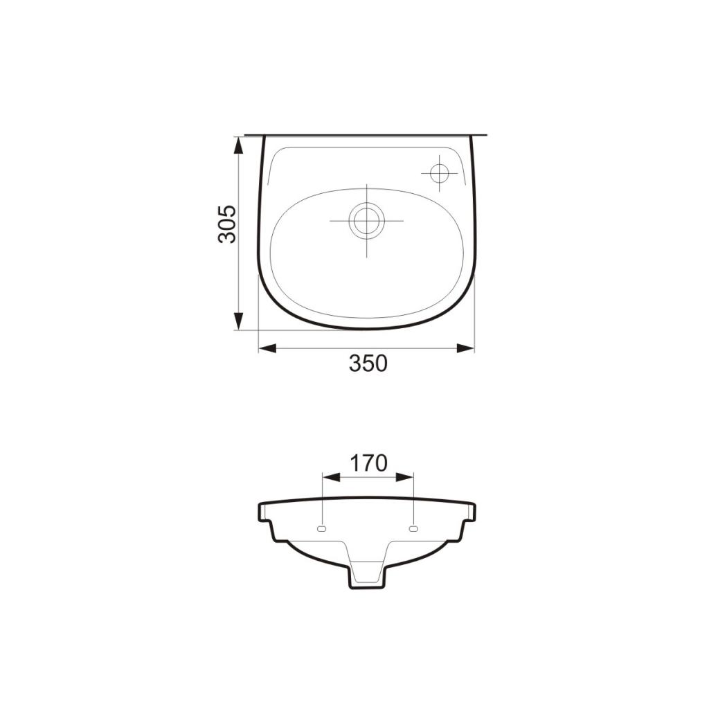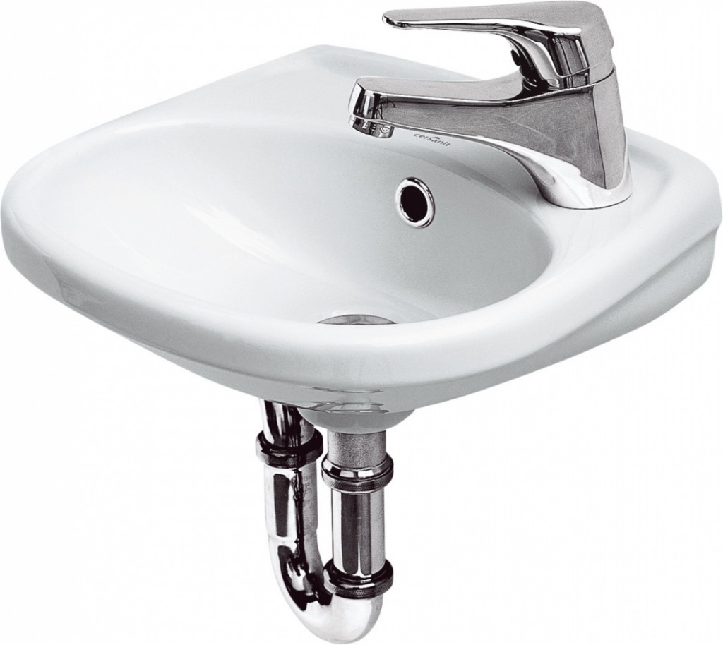 Nástěnné umývátko s přepadem a otvorem na baterii na pravé straně. Doporučená montáž s dekorativním sifonem.