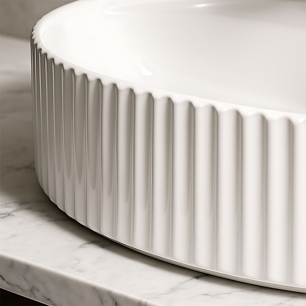Žebrované umyvadlo Marcela na desku je elegantní kombinací funkčnosti a moderního designu. Je vyrobeno z vysoce kvalitní sanitární keramiky, je odolné, odolné proti poškrábání a snadno se čistí. Jeho oválný tvar s ozdobnými svislými žebry na vnějších stěnách dodává každému interiéru jedinečný charakter a jemnou texturu, čímž zdůrazňuje jeho designový styl.