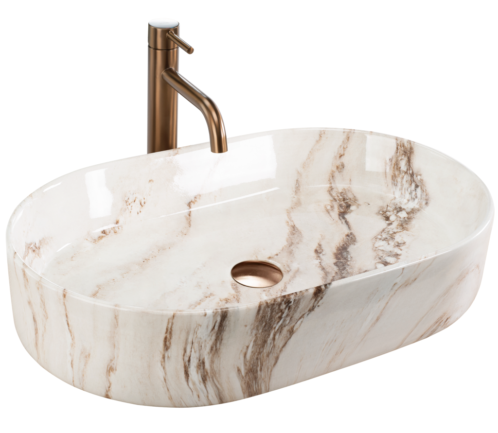Představujeme Vám moderní nové umyvadlo na desku série Rea Nadia. Umyvadlo netradičního tvaru je vyrobeno z materiálů nejvyšší kvality a jeho vlastnosti splní veškeré vaše požadavky. Tento model ocení především zákazník, hledající funkční, ale také estetické řešení. Umyvadlo je určeno k montáži na desku, ale je možné ho kombinovat i se skřínkou. Umyvadlo v provedení, které napodobuje světlý kámen, se navíc díky speciální fázi výroby snadno čistí, je velice odolné a má jedinečný vzor.