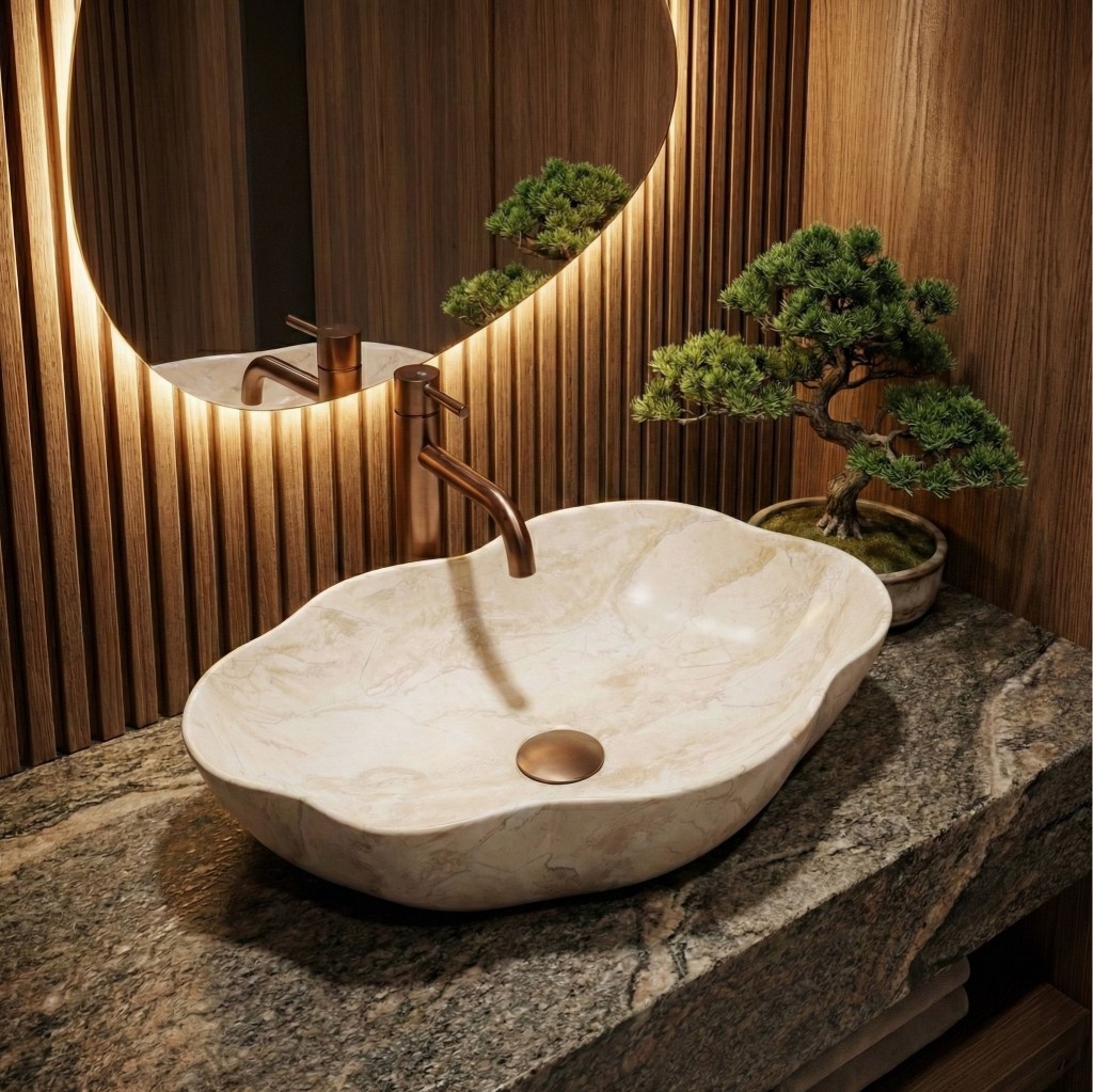 Umyvadlo na desku Rea Pearl Kallisto je model s jedinečným charakterem, který kombinuje funkčnost sanitární keramiky s estetikou přírodního kamene. Vyniká asymetrickým tvarem a elegantním kameninovým dekorem, díky čemuž je výrazným prvkem vybavení koupelny.Asymetrická forma – nepravidelná, zvlněná linie okrajů odlišuje tento model od klasických, geometrických mís a dodává aranžmá jedinečný styl.Povrch Kallisto – matná plocha je zdobena vzorem připomínajícím kámen v odstínech béžové a krémové, což vnáší do interiéru eleganci.Sanitární keramika – materiál zaručuje trvanlivost, odolnost proti poškrábání a snadné čištění i přes dekorativní charakter produktu.Montáž na desku – umyvadlo je přizpůsobeno instalaci na desku nebo skříňku, což umožňuje plně vyniknout jeho ozdobné formě.Univerzálnost – díky tlumené barevnosti se model skvěle kombinuje jak se zlatou, tak měděnou armaturou a hodí se do interiérů glamour i moderních.Umyvadlo Rea Pearl Kallisto je volbou pro ty, kteří hledají odolnou keramiku v neotřelém provedení. Spojení asymetrické formy s каменным vzorem z něj dělá efektní a praktickou alternativu ke стандартным bílým umyvadlům.