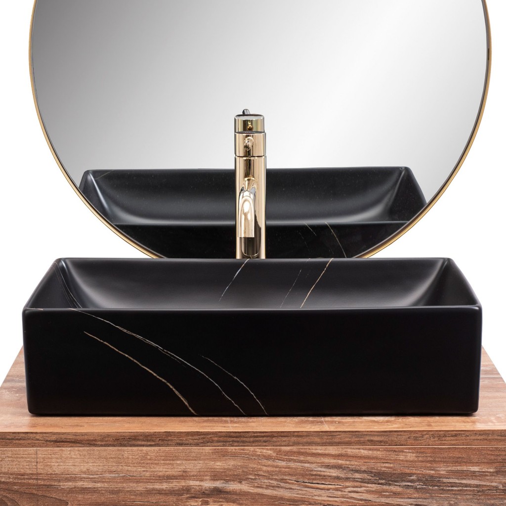 Krásné a extrémně funkční černé umyvadlo Inga se zlatými žilkami imitujícími přírodní kámen. Každá kopie má jedinečný a jedinečný vzor. Jedná se o výrobek, který dokonale vyplní prostor vaší koupelny při zachování dokonalého vzhledu a estetiky interiéru. Umyvadlo je určeno k montáži na desku nebo na skříňku. Díky speciální výrobní fázi je odolný a snadno se čistí. Nejkvalitnější sanitární keramika s matnou černou povrchovou úpravou upoutá pozornost každého.