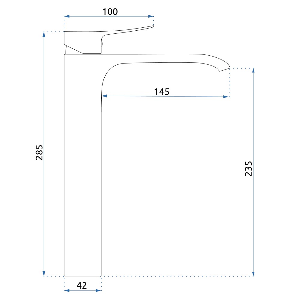 Svou výškou 28,5 cm je umyvadlová baterie Dart jako stvořená k montáži na desku. Samotná hubice vyrostla do výšky 23,5 cm od desky, a dosah hubice má 14,5 cm. Konec výtoku má opatřený perlátorem, pro úsproru vody.