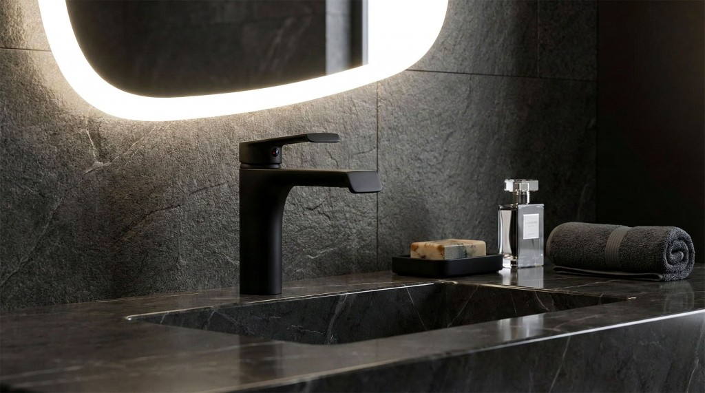 Pro dokonalý vzhled celé koupelny doporučujeme sladit jednotlivé prvky. Baterii už máte. Nezapomeňte pořídit i efektní černou výpust, která dodá celému umyvadlu tu správnou tečku.