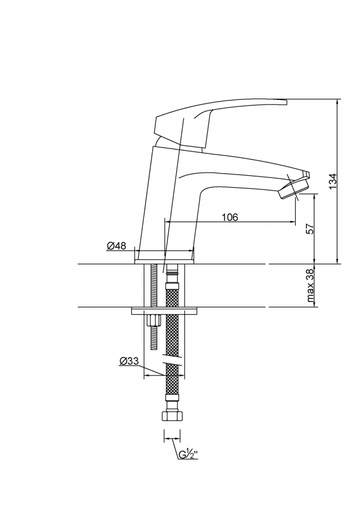 - dosah výtoku u této baterie je 106 mm, výška baterie je 134 mm a výška výtoku je 57 mm