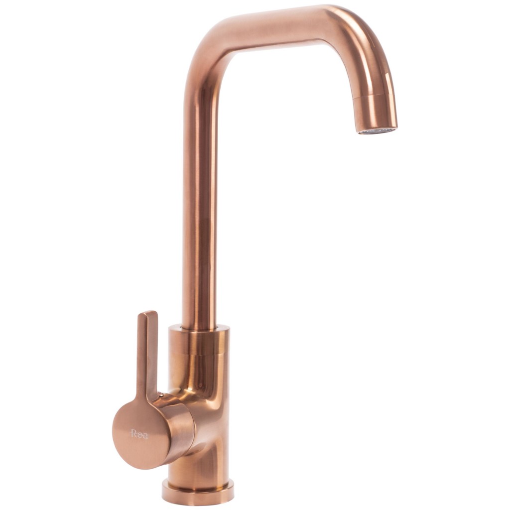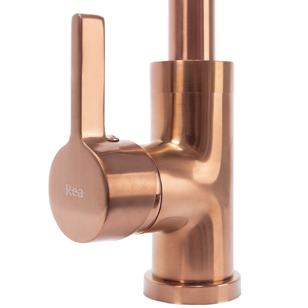 Vysoká umyvadlová baterie Rea Folk je přizpůsobena pro montáž na desku nebo umyvadloByla vyrobena z mosazi a pokryta zlatorůžovým povlakem, který působí fenomenálně. Díky speciální fázi výroby je odolná a snadno se čistíJejí barva byla získána galvanizačním procesem, který zaručuje odolnost proti oděru a mechanickému poškození.
