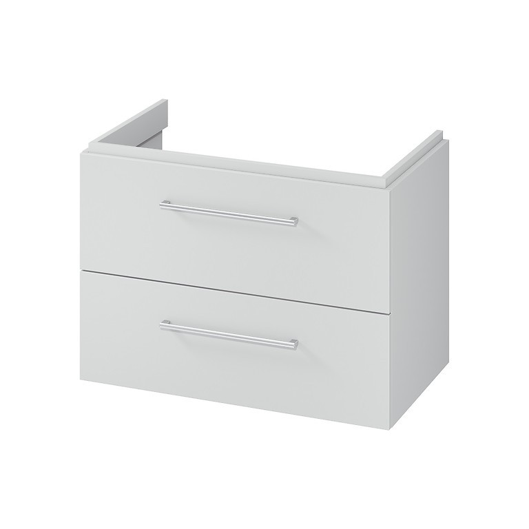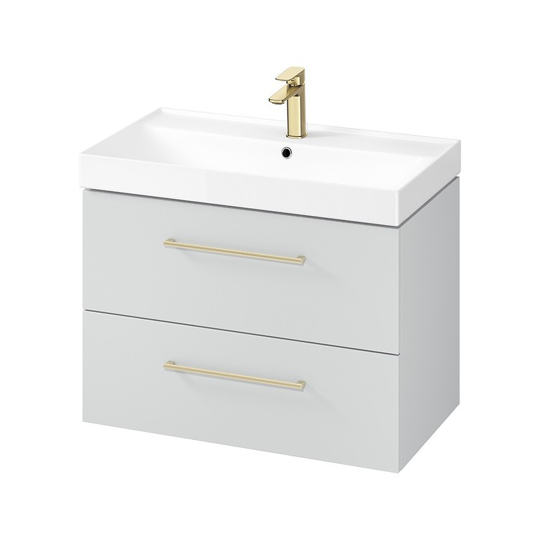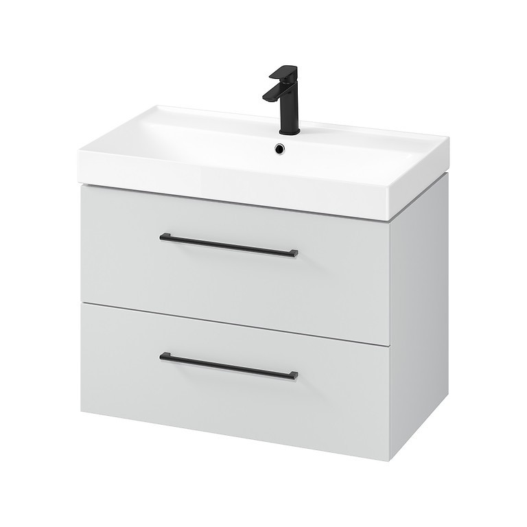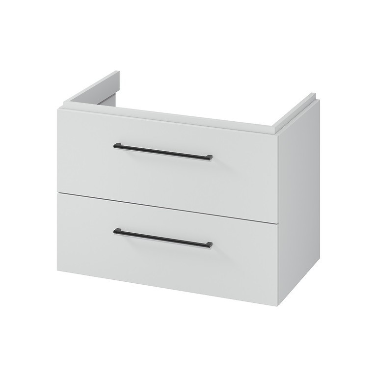 Umyvadlová skříňka LARGA s šedým vnitřkem dvou prostorných zásuvek s měkkým zavíráním soft-close. Dřevotřísková deska, ze které je skříň vyrobena, má certifikát FSC MIX 70% SGSCH-COC-007574. Nábytková frézovaná madla lze vybrat ve třech barvách (stříbrné, zlaté, černé), k zakoupení samostaně, není součástí skříňky.