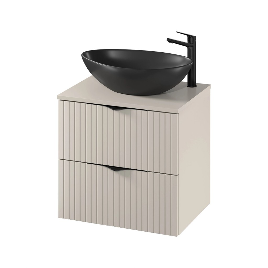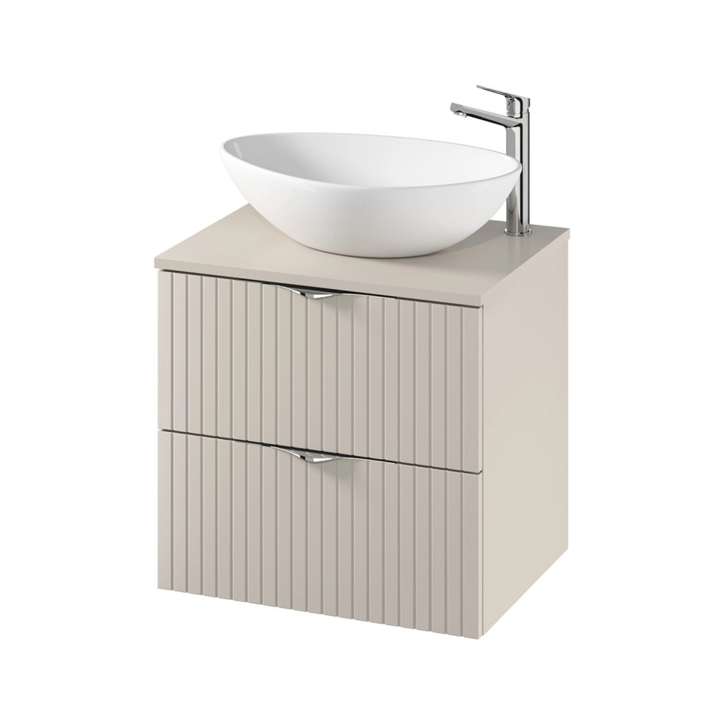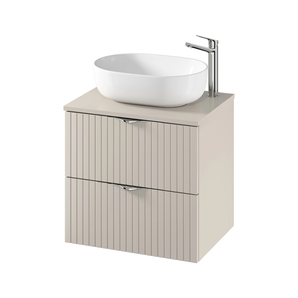 K této modulové nábytkové sestavě se hodí umyvadlo na deku se stojánkovou baterií vysoké verze, jelikož se umístí na desku vedle umyvadla. Vhodné je pak doplnit umyvadlovou výpustí a nábytkovým úsporným sifonem, který je navržen tak, aby šetřil místo pod umyvadlem.