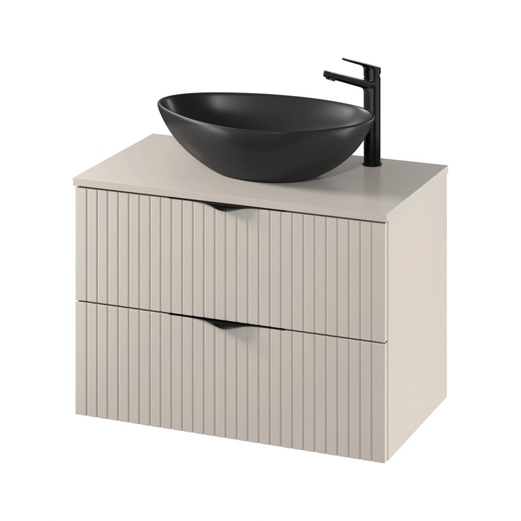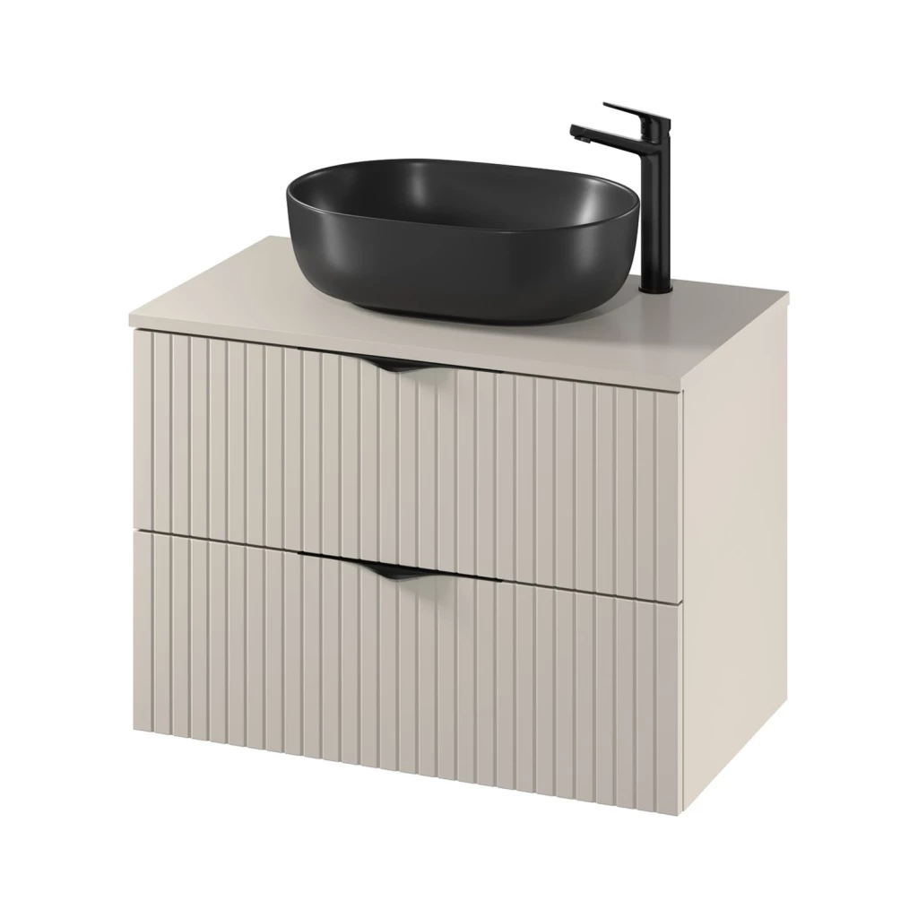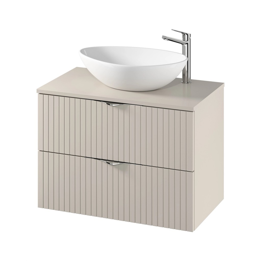 K této modulové nábytkové sestavě se hodí umyvadlo na deku se stojánkovou baterií vysoké verze, jelikož se umístí na desku vedle umyvadla. Vhodné je pak doplnit umyvadlovou výpustí a nábytkovým úsporným sifonem, který je navržen tak, aby šetřil místo pod umyvadlem.