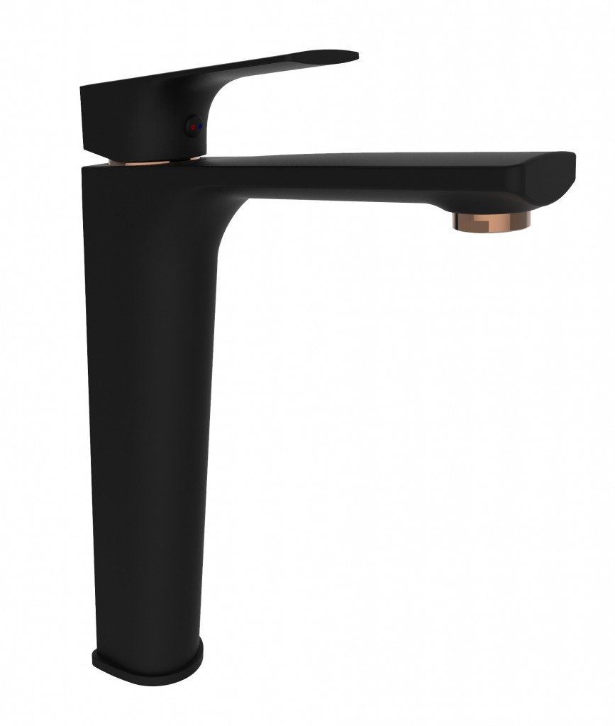 Umyvadlová vysoká baterie MODENA-18D v černé - růžově zlaté barvě z nabídky, jedná se o baterii s velmi příjemným moderním designem. Vysoká umyvadlové baterie je hlavně určená pro instalaci k umyvadlům, která jsou položená na desce. Stojánková baterie je vyrobena z prvotřídních materiálů a pro úsporný provoz je opatřena kvalitním perlátorem Neoperl.