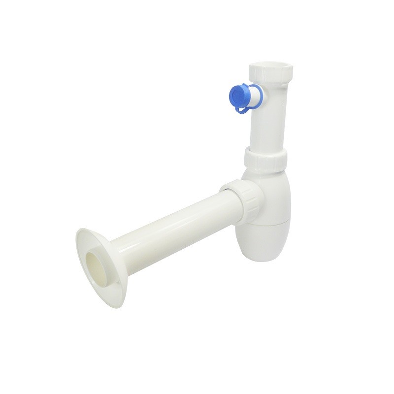 Sifon pro optimální připojení na stěnu a ke dřezu. S převelečenou maticí pryžovým těsněním, s odbočkou, bez pilety.