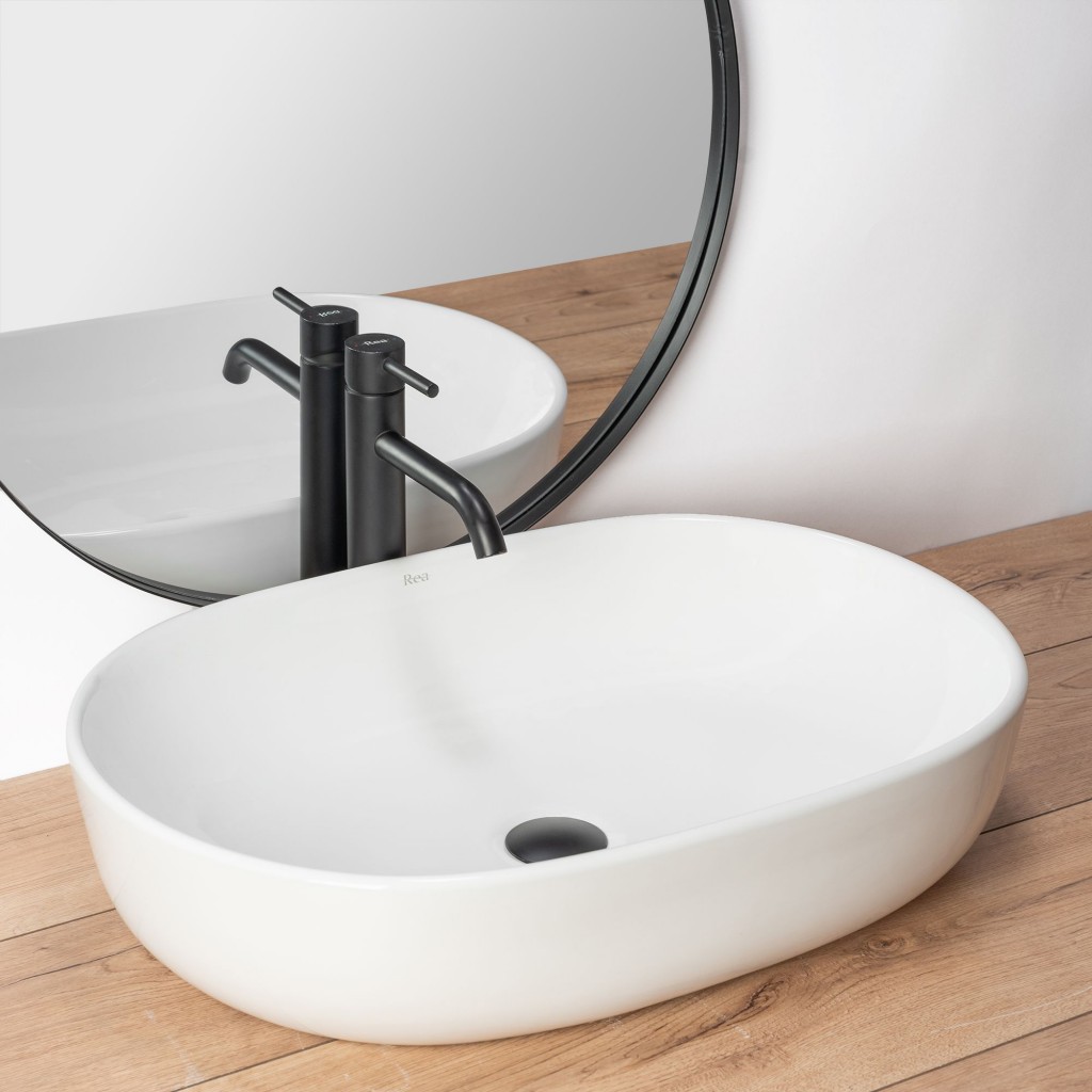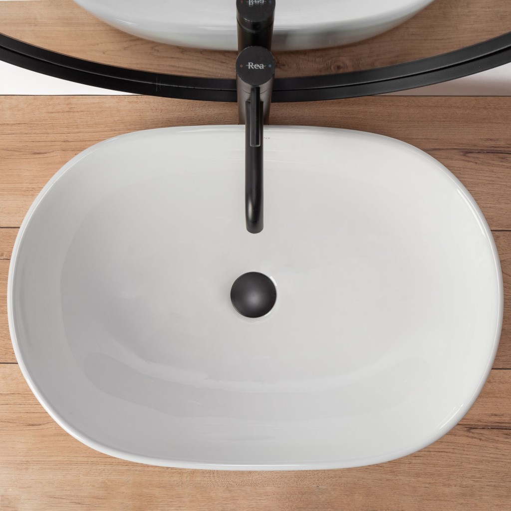 Umyvadlo na desku Rea Amelia 59 s jedinečným vzhledem a funkčností na nejvyšší úrovni. Pokud chcete vaší koupelně dát eleganci a snadné použití, umyvadlo Amelia 59 je právě pro vás. Tento výrobek je vyroben z vysoce kvalitní sanitární keramiky, povrchově upraven sněhově bílou, lesklou glazurou. Univerzální tvar a montáž na stůl se hodí k mnoha povrchovým úpravám a stylům.