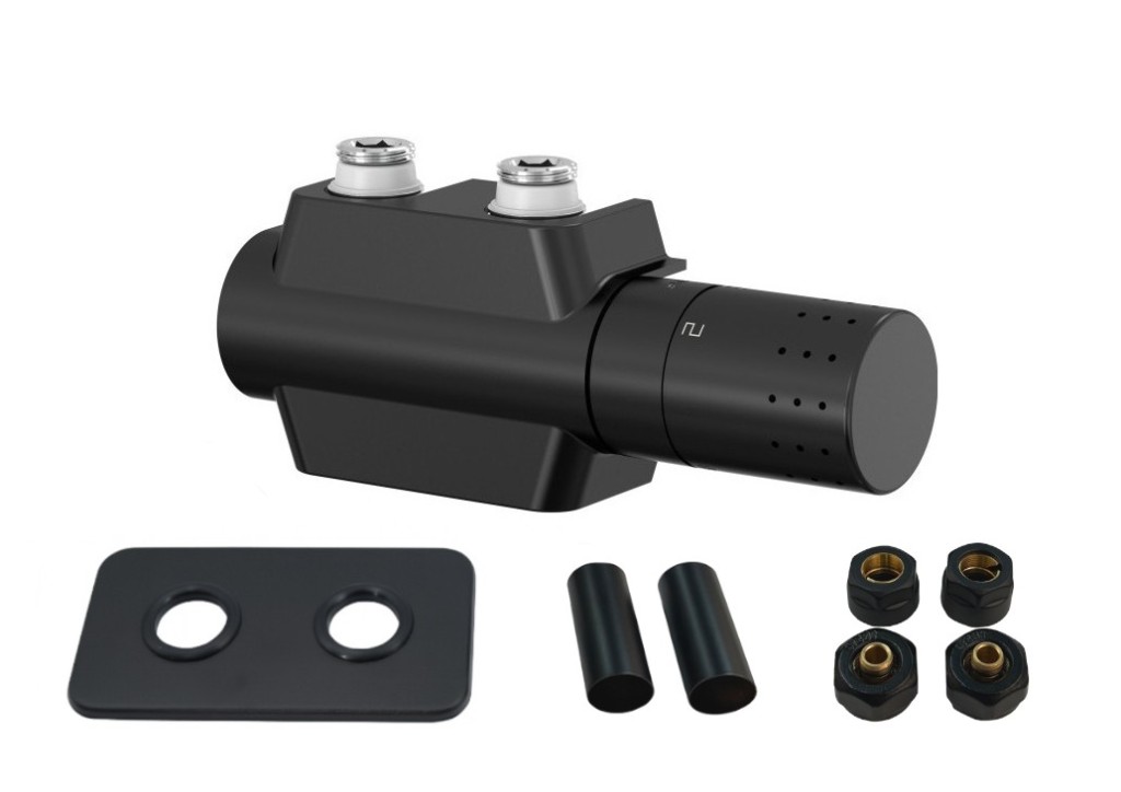 Středová oboustranná (levá i pravá) termostatická sada UNI vč. 1 krycí rozety a 2 krycích trubiček (plast) je určena pro připojení radiátorů na rozvody TUV s vývodem ze zdi i z podlahy s roztečí 50mm.