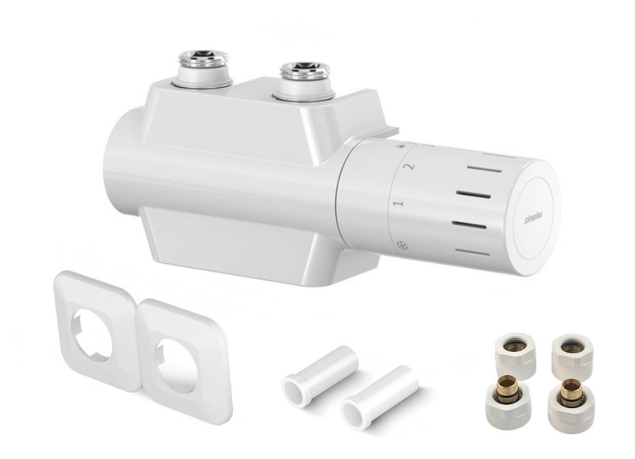Středová oboustranná (levá i pravá) termostatická sada UNI vč. 2 krycích rozet a 2 krycích trubiček (plast) je určena pro připojení radiátorů na rozvody TUV s vývodem ze zdi i z podlahy s roztečí 50mm.
