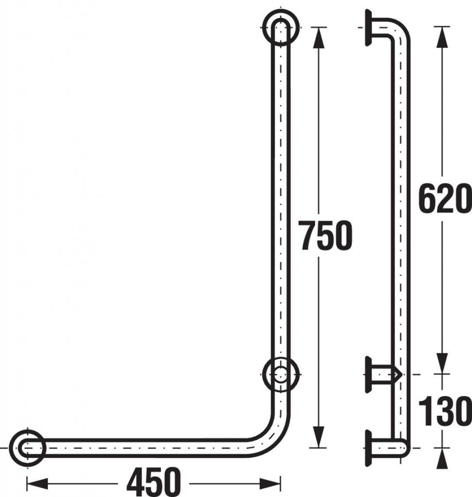 Pevné madlo do sprchy (pravá varianta) o délce 750 mm patří do příslušenství pro koupelnu bez bariér Universum a je vyrobeno z ušlechtilé leštěné nerezové oceli.Madlo splňuje vyhlášku č. 398/2009 Sb., o obecných technických požadavcích zabezpečujících užívání staveb osobami s omezenou schopností pohybu a orientace, která je platná od listopadu 2009.