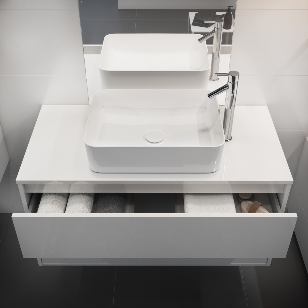 Závěsná umyvadlová skříňka pod umyvadlo na desku CREA 80 se dvěma výsuvnými boxy v bílém lesklém provedení a elegantním šedým lněným vnitřkem. Vyrobená je z dřevotřískových desek s moderní technologií AQUASAFE /zvýšená odolnost proti vlhkosti/. Skříňka působí elegantním vzhledem díky zapuštění přední části a využití skrytých madel. Zásuvky jsou vybavené pojezdy "HAFELE" s plným výsuvem a tichým uzavíracím systémem, který zvyšuje komfort používání. Skříňka lze kombinovat s umyvadly na desku.