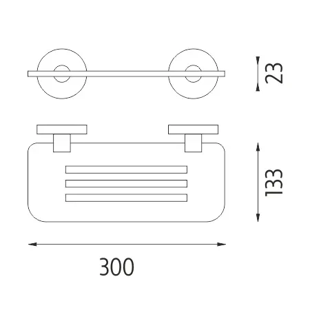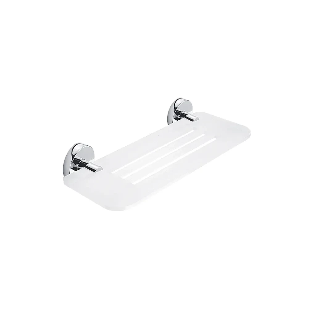 Police s frézovanými otvory. Materiál plexiglass s matovaným povrchem. Délka 30 cm. Úchyty mosaz/chrom.