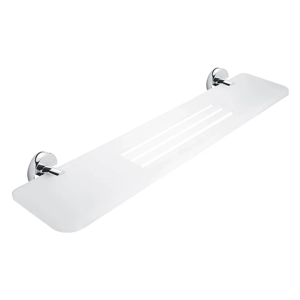 Police s frézovanými otvory. Materiál plexiglass s matovaným povrchem. Délka 60 cm. Úchyty mosaz/chrom.