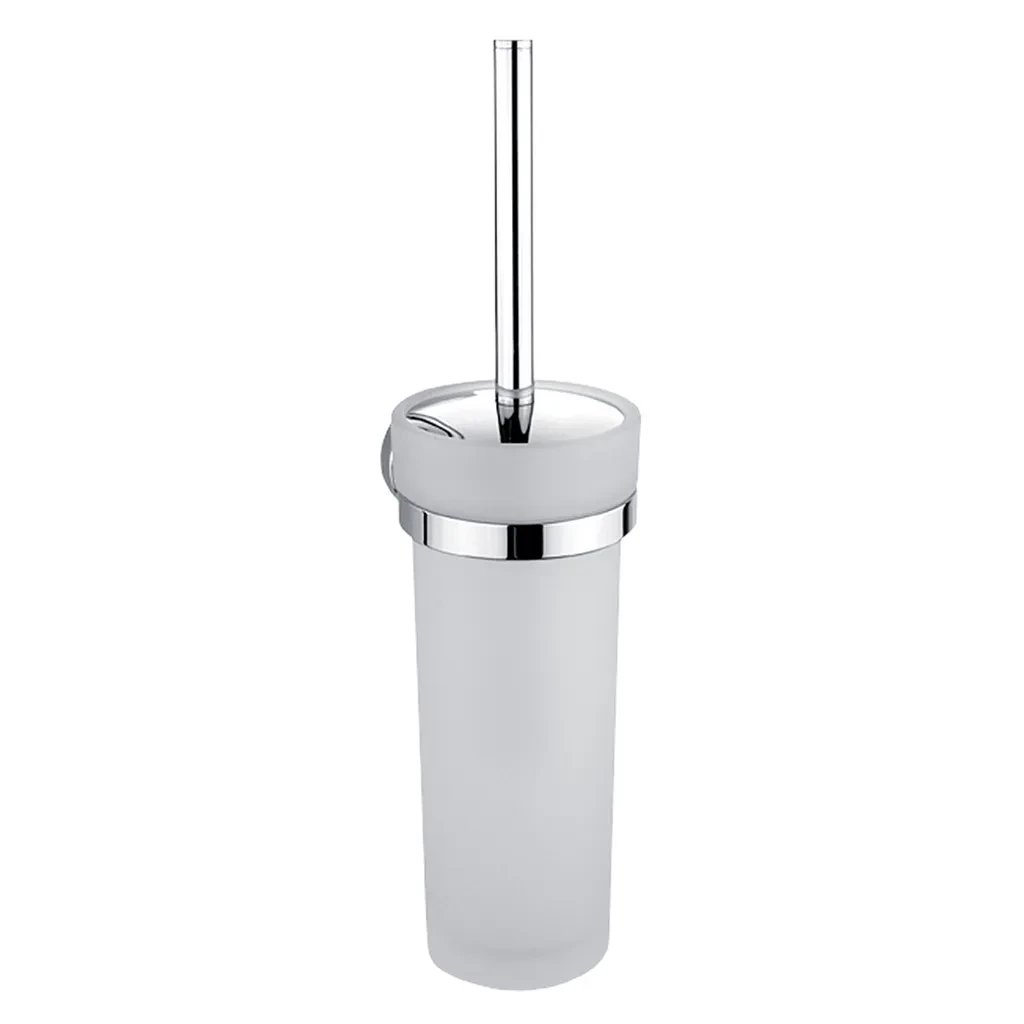 Toaletní WC kartáč s nádobkou z matovaného skla. Rukojeť kartáče z mosazi s povrch. úpravou chrom.